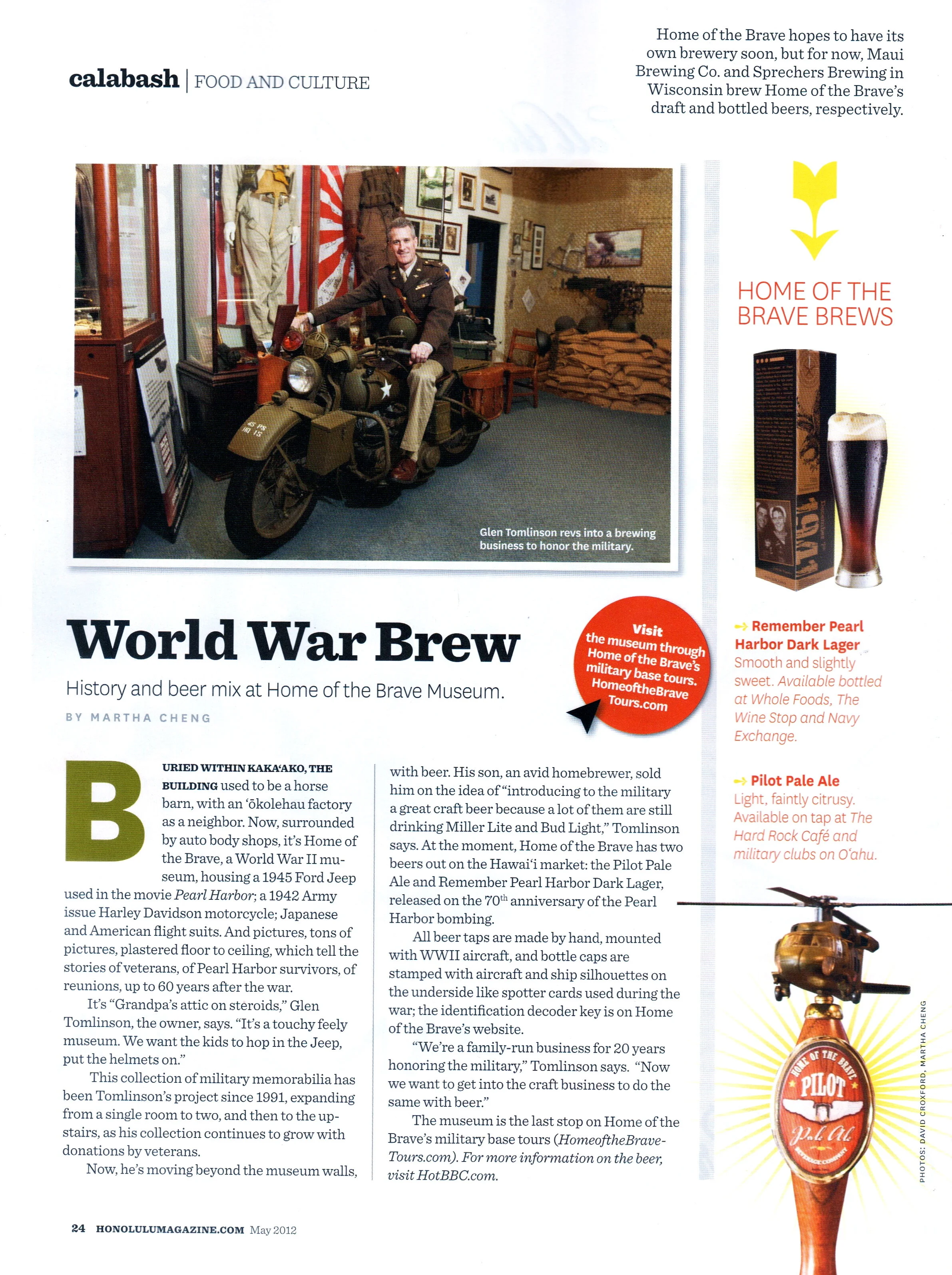 Started in 2009, Home of the Brave Brewing Company brewed its first draft run of Pilot Pale Ale at Maui Brewing Company. The response was fantastic and led to keg taps around Honolulu and Military Clubs on Oahu. Bottled Beer came next with the help from our friends at Sprechers in Wisconsin, first brewing our famous Remember Pearl Harbor Dark Lager, honoring the 70thAnniversary of the Pearl Harbor attack. Packaged Pilot Pale Ale was then brewed and self-distributed by Home of the Brave Beverage Company to island Military Exchanges and select upscale retailers. In July 2014, we expanded our Brewseum - a brewpub+museum concept hand-built by the Tomlinsons and now ranked the number brewpub in Honolulu (visit www.Brewseums.com) where we pour our epic brews!
